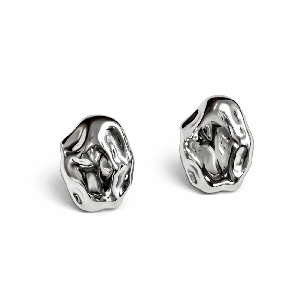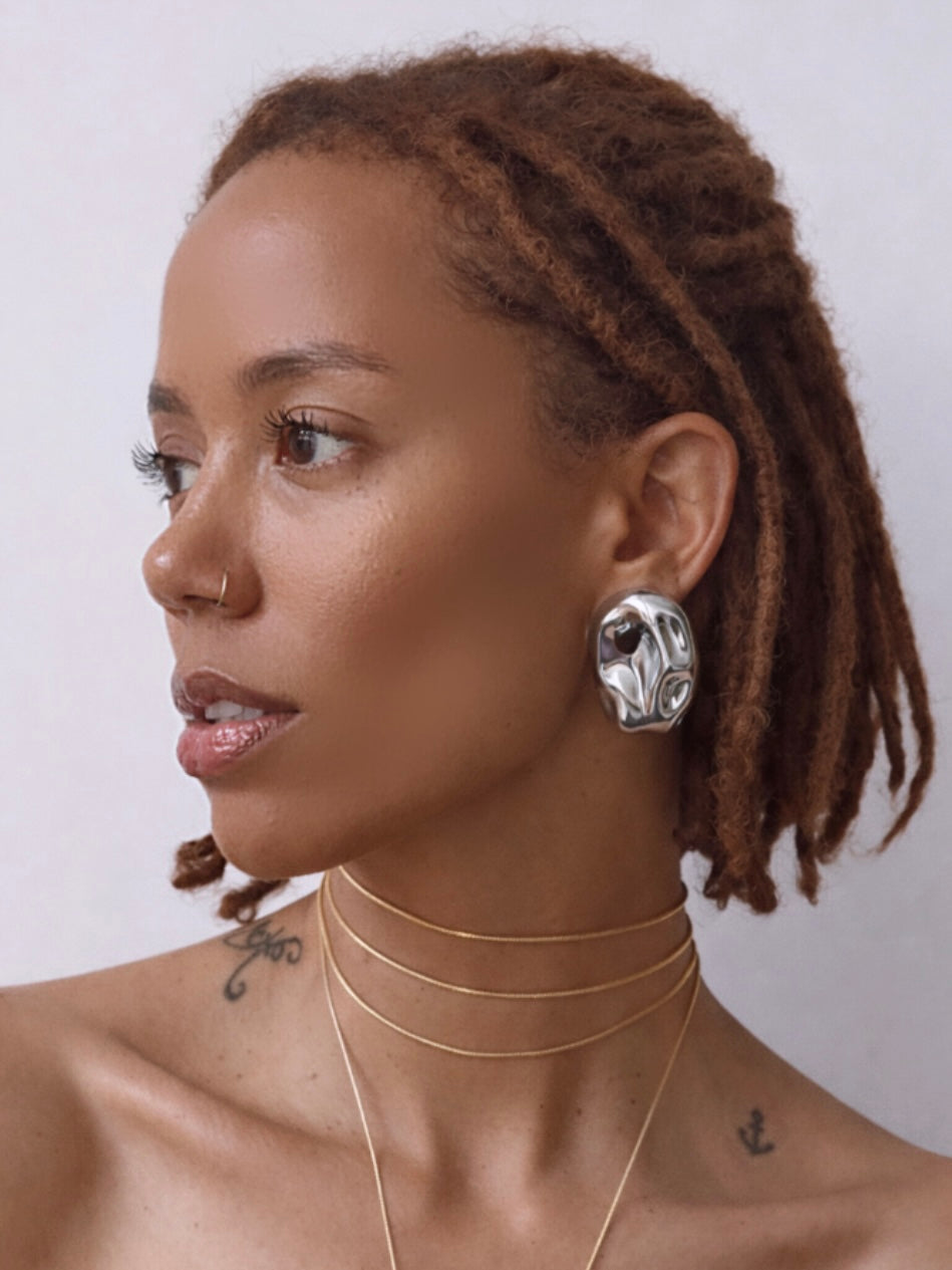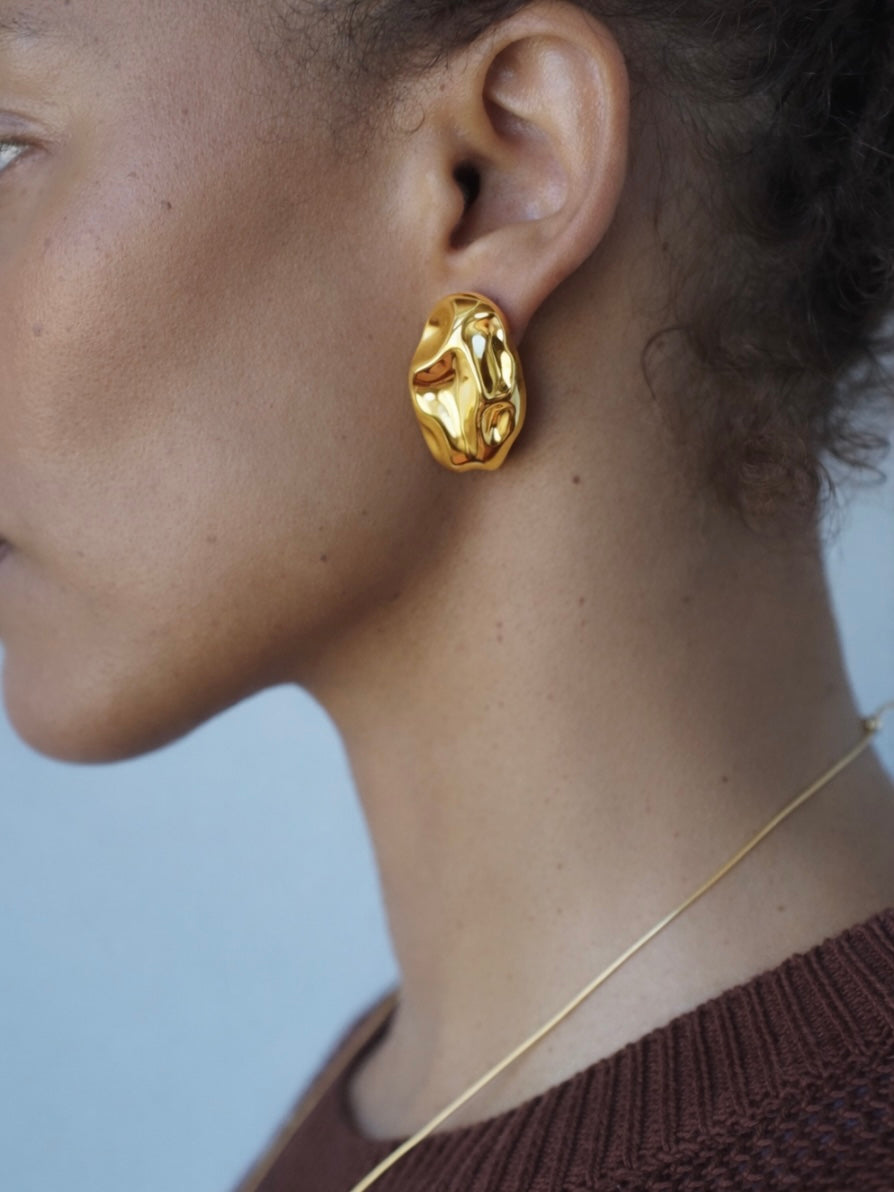 Molten sculptural stud earrings made with reclaimed silver and 18k gold-filled metal. Lightweight organic statement earrings.