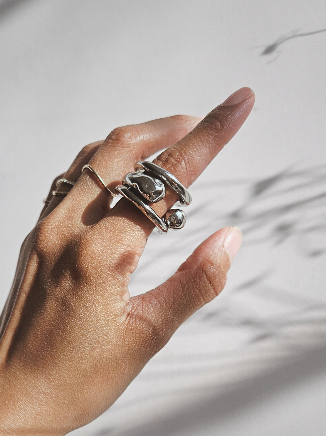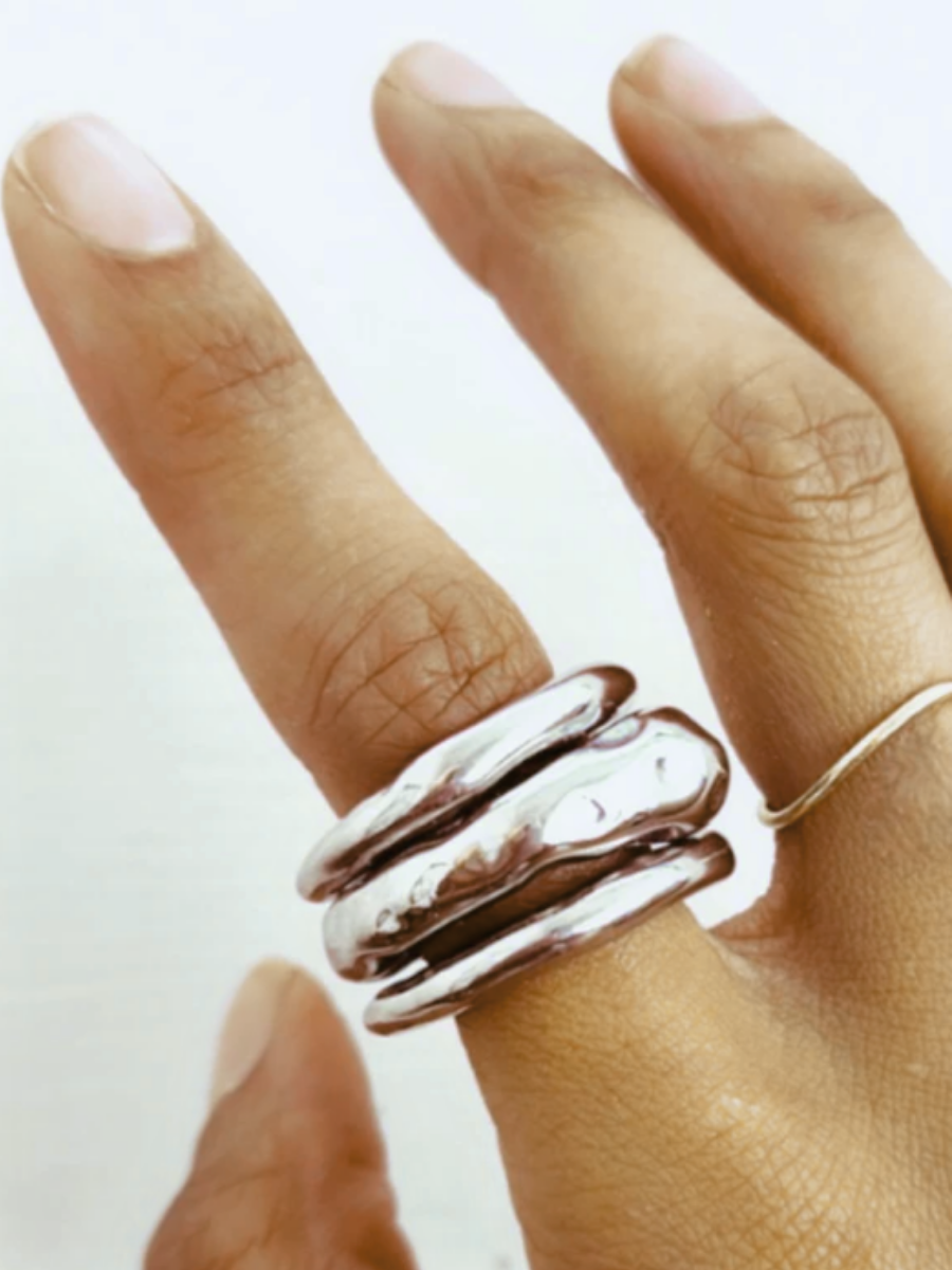 Artistic expression of intuition and protection.Three sculpted bands, encompassing one open center. Conveying protection of insight, and receiving. The portal.