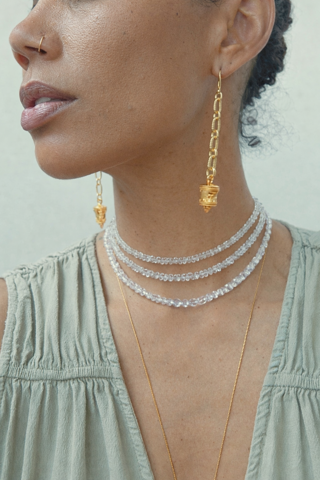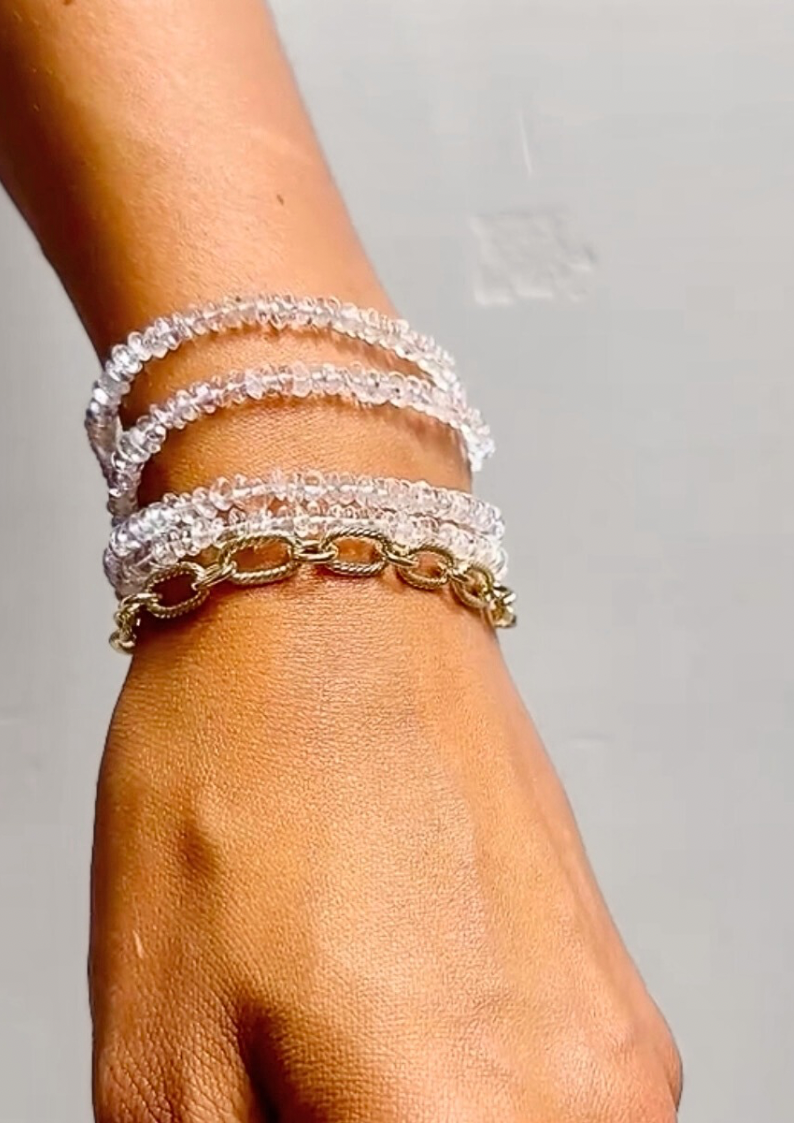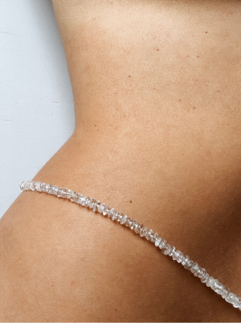 Clear Raw healing body chain. Wear as a waist chain or anklet for versatile styling. Symbolizing the 3 cycles of life. Death, transformation and rebirth. A luminous amplifier, bringing clarity, focus, and a refined sense of inner alignment. PLEASE ALLOW 1-2 WEEKS PRODUCTION TIME.
